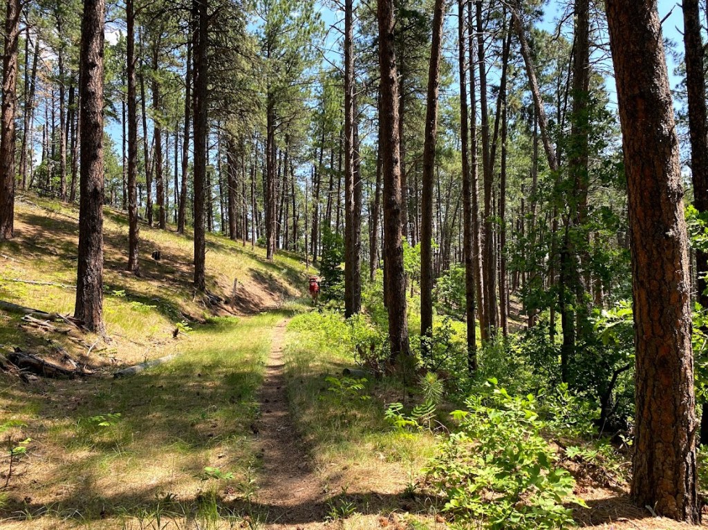 Similar to yesterday, the trail traveled up and down. However, all of us preferred today’s terrain. The ridges were open instead of thick with vegetation. I was fascinated by the forest, a mix of oak, pine, and an unfamiliar tree species. There were also ferns and many wildflowers. Jenessa found a patch of wild strawberries and picked six to share. At the top of our climb, we glimpsed Bear Butte in the distance! We stopped for lunch, excited by our progress.