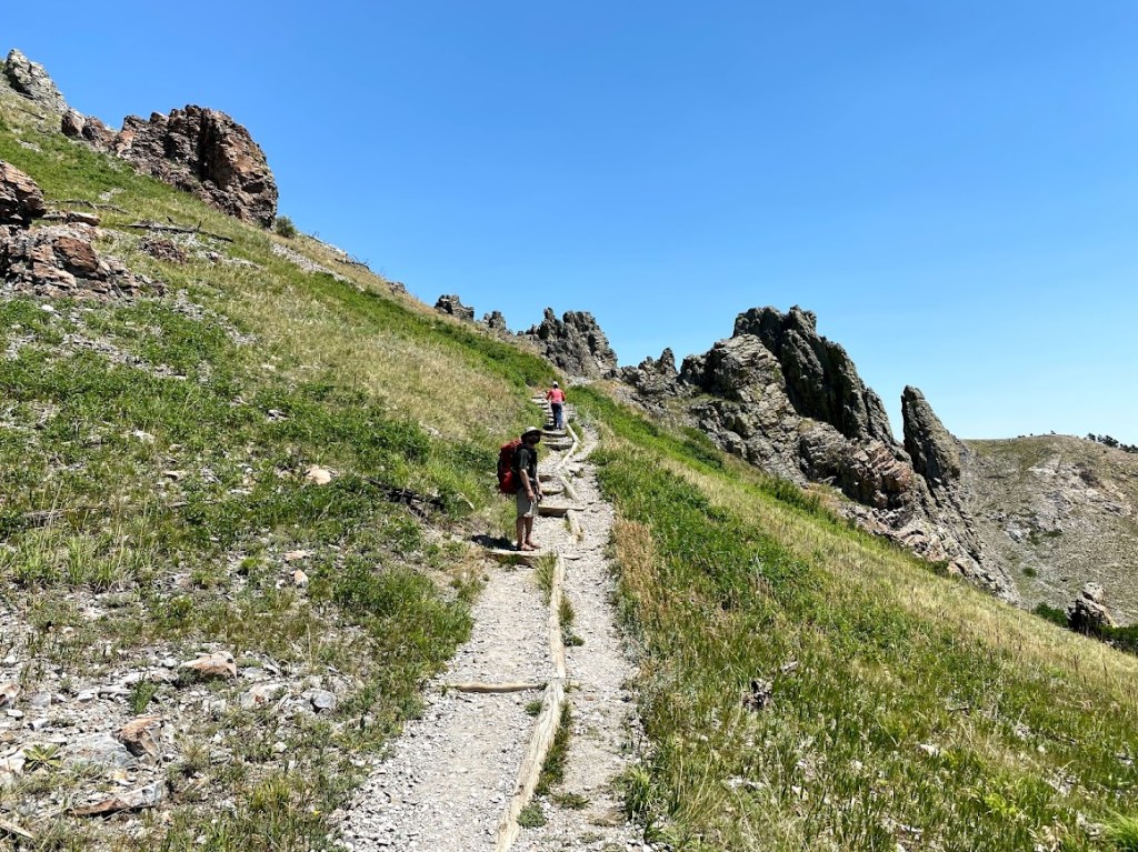 When we reached the visitor center parking lot, we ate half our lunch and filled our water bladders. It was not yet noon and there was a slight coolness to the breeze. We kept our backpacks on for the ascent, though Jenessa had threatened to leave hers in the car. (I keep telling her she’s a badass!) The butte trail rises 1,000 feet over 1.5 to 2 miles. It was easier than I envisioned due to a well-developed, switchback filled trail. I also thought we would be the only ones ascending in the heat of the day but there were many people.