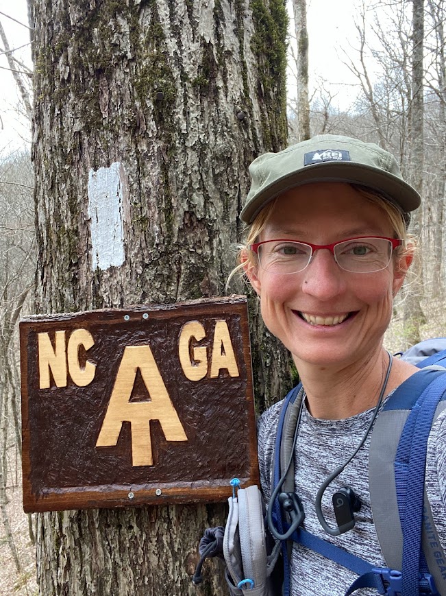 The landscape was foggy and mysterious. I walked along in high spirits, eager to be back on the trail. As I made my way up Cowrock Mountain, a noise in the woods made me look to my left and I spotted three pigs, two black and one white with black spots. I was surprised to see them there. (Looking it up later I read that feral swine are considered an invasive species in Georgia.) Shortly afterwards I spotted a snail leaving a slime trail as it proceeded down the trail. So cool! The fog lasted most of the morning and at one point became a light drizzle so I put on my rain jacket and pack cover.