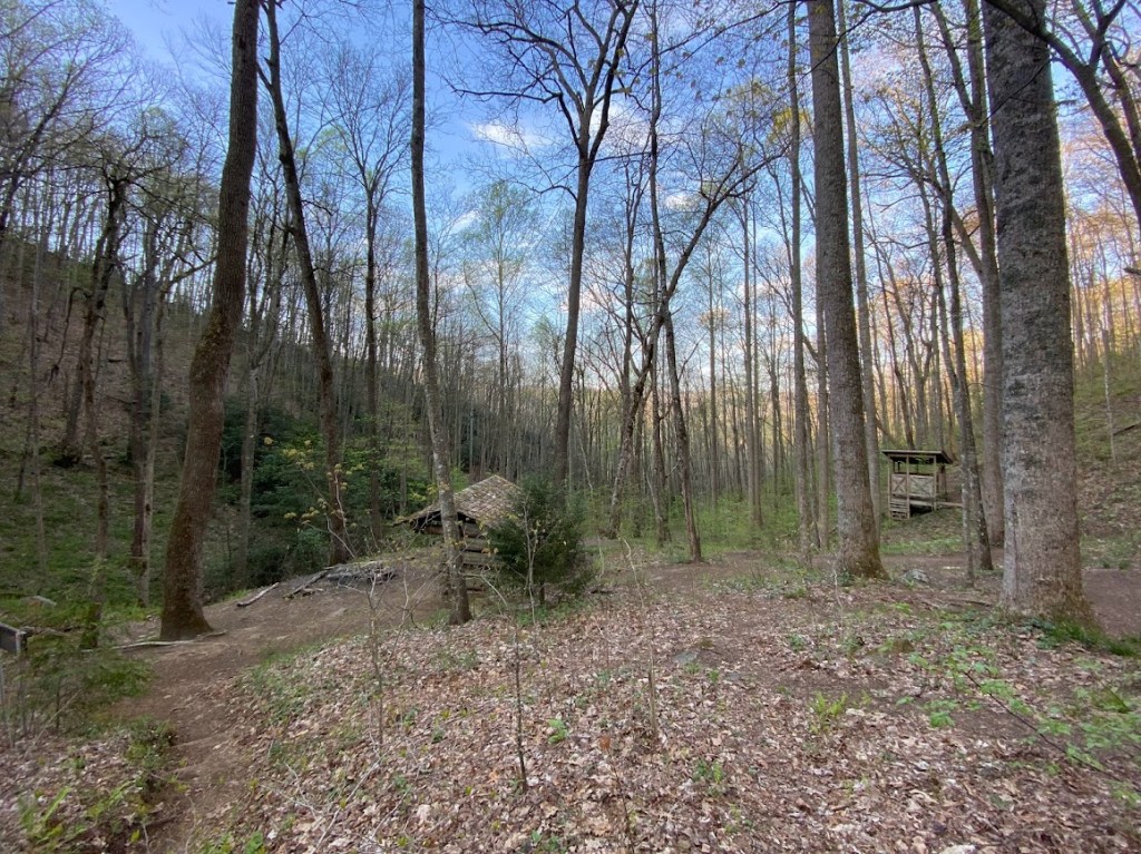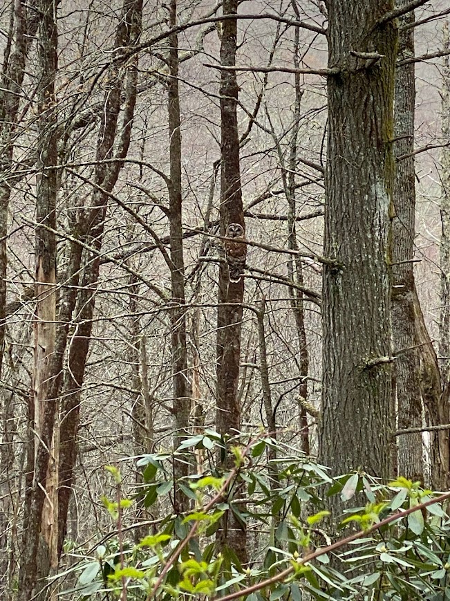 Shortly after a late lunch I summited Wesser Bald. It had a fun observation tower whose wooden platform offered a 360 degree view. Afterwards the trail followed a ridge line for several miles then descended steeply. I surprised two yellow-striped lizards sitting on a log. White flowering trees appeared in solo or clusters amongst the bare branches.