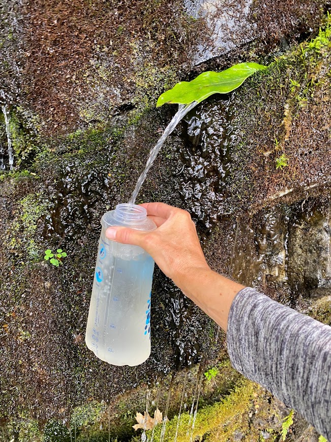 About 1 pm, in the heat of the day, I left the Center and began the climb to Cheoah Bald. It was a 4,000 ft plus climb counting the dips into gaps and one shelter. I really enjoyed it and felt full of energy. On the way I stopped at a couple springs to refill my water bottles. AT water is delicious! A lot of the springs have one leaf or several inserted to make a natural spout. Here is a picture: