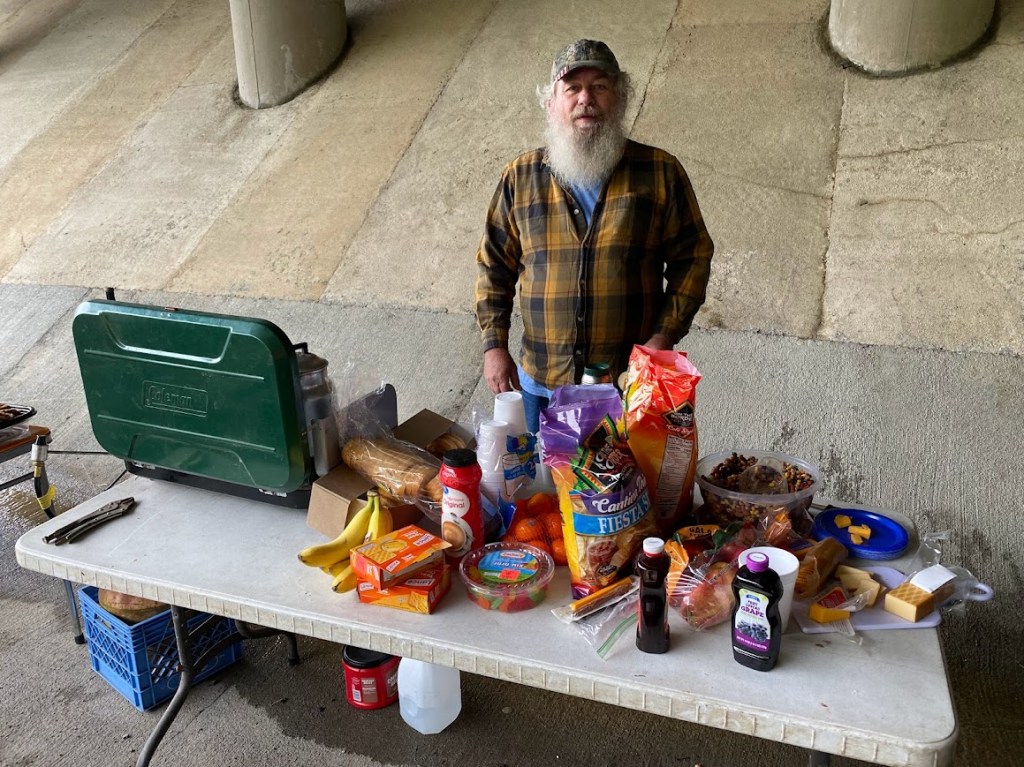 Shortly after noon a paper sign directed me to the right and trail magic 3. A neighborhood group from a nearby subdivision – I spied one house in the fog – put together an impressive spread. I enjoyed a hard boiled egg, Beyond Meat patty, and bean salad! It’s really amazing and wonderful how giving people are along the AT. Eventually I got chilled so I thanked the group and moved on. I grazed my way down the trail this morning!