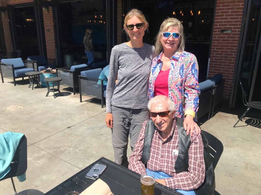 Doug drove us to the Yee-Haw Brewery in Johnson City. The brewery was housed in an old train depot along with White Duck Taco Shop. We sat in their large patio area, enjoying the sun and cute downtown area. I had my first Tennessee hard cider and tasty tacos. Jimmy and Pam told me family stories. Jimmy is quite articulate for a 90 year old! Afterwards Doug drove us to a hilltop view and pointed out all the mountains I will be climbing on my way to Damascus.