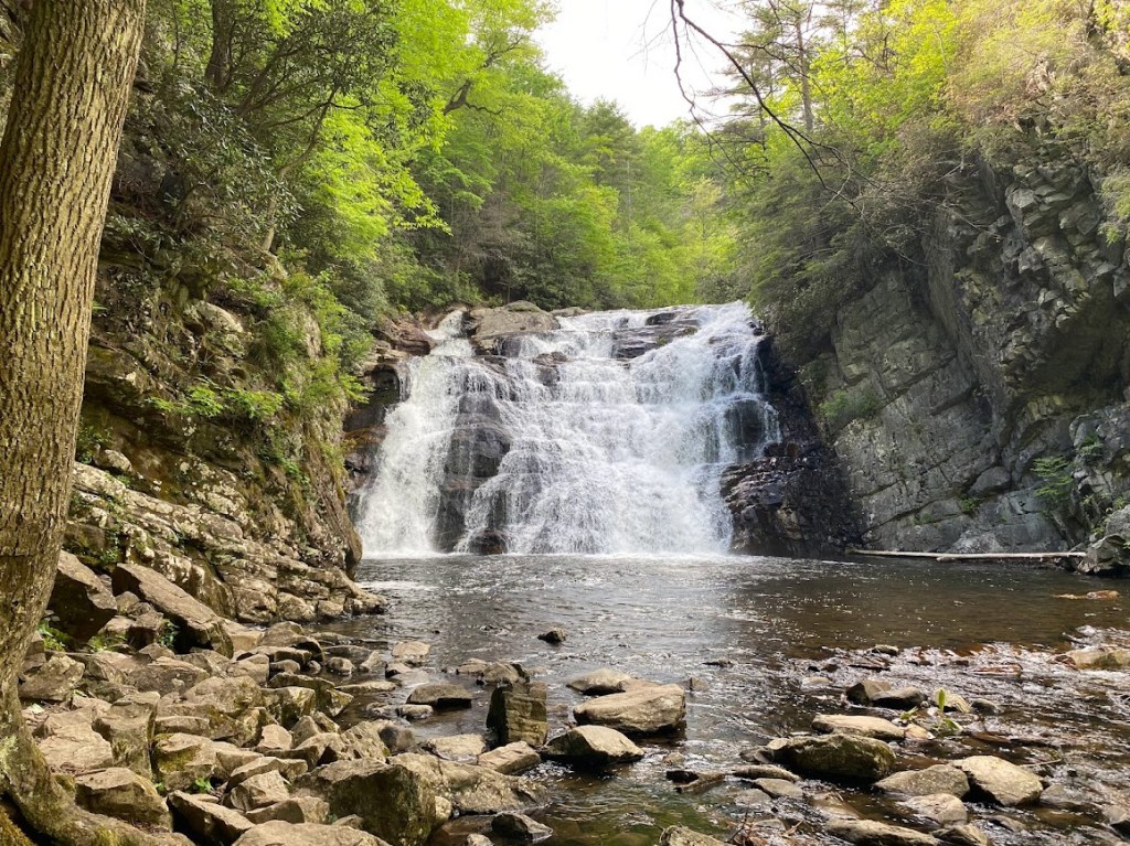 A large wooden bridge spanned the Laurel Fork River. I ran into a solo day hiker who said he sat by the water for hours and then drank out of it with his LifeStraw. He seemed entirely blissed out by nature, a feeling I understood. The trail passed through two steep-walled clefts, then descended to the impressive tumbling cascade of Laurel Fork Falls. Past the falls, the trail became a rock ledge that hugged the base of a sheer cliff.