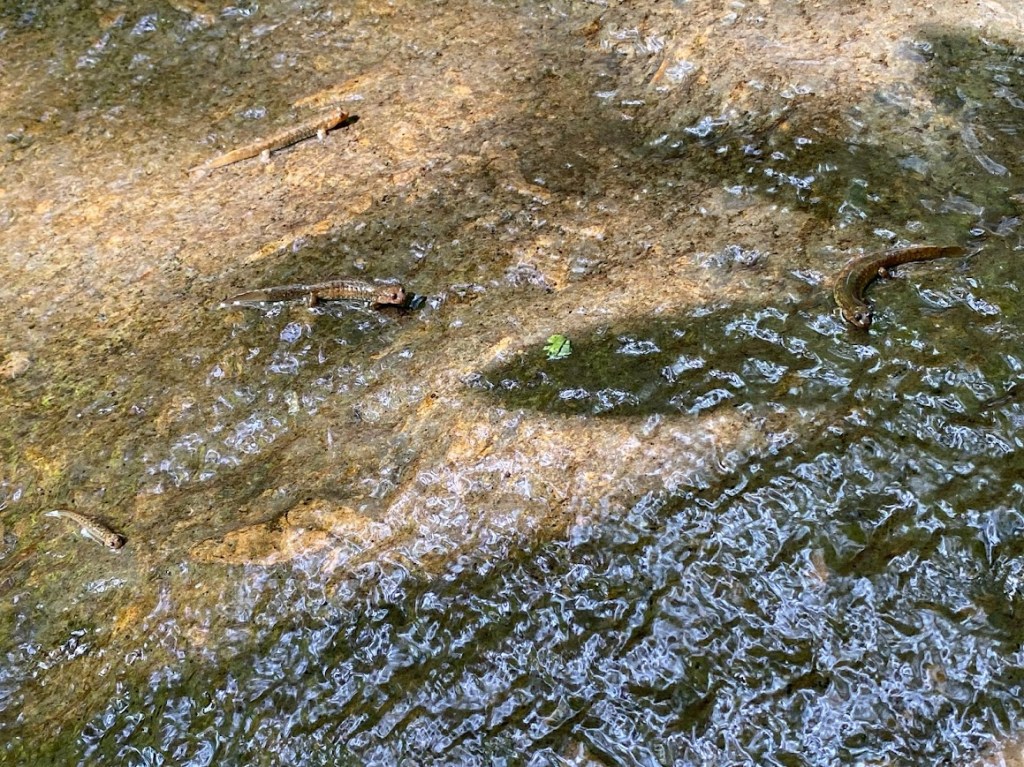 Laurel Fork shelter was empty when I arrived. A small cascade nearby served as the shelter water source. I discovered a salamander family, three big and one small, hanging out in the shallow wash of water over a big rock. I was so excited!! They looked almost fake with their big black eyes and rubbery-looking bodies. I watched them for a while. As I returned from filtering, I encountered Striker. Yay, he set a new mileage record! We were soon joined by a guy named Sonic Boom, from Seattle. I had a lot of fun talking with him about food and trails.