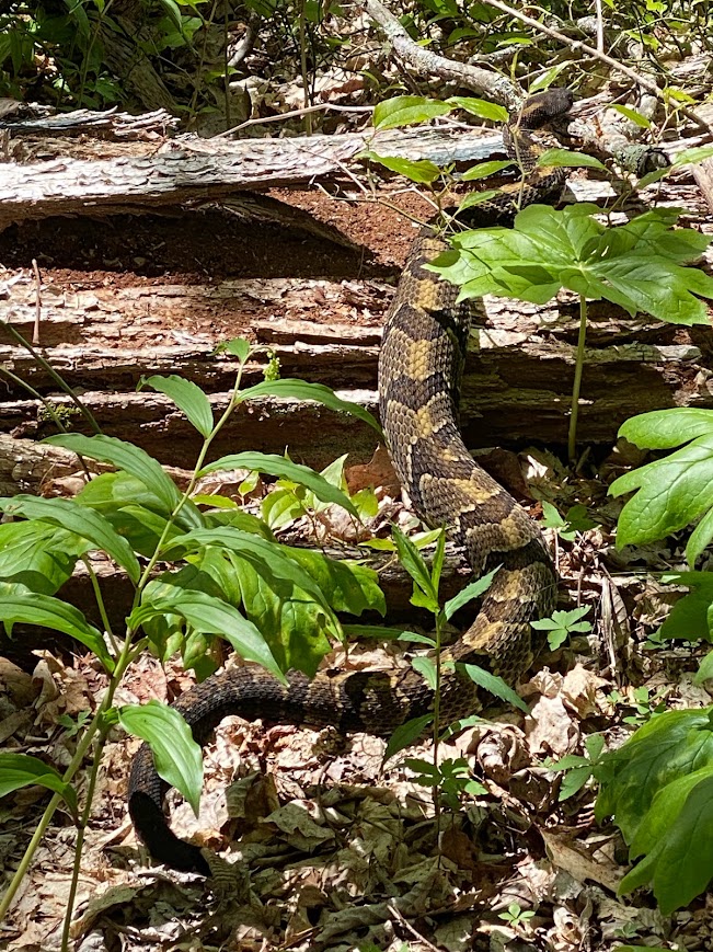 An hour or so later I stopped to put on my sunglasses and heard a polite rattling noise. I looked right to see a gorgeous Timber Rattlesnake. It slithered slowly off and I followed, trying to get a good picture. It rattled intermittently and I eventually left it in peace. Batman & Robin weren’t far ahead and they had also seen the snake. We exchanged photos.