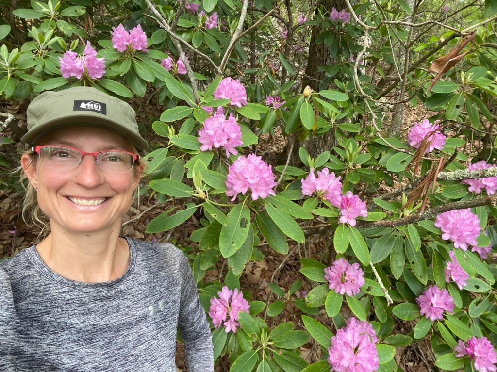 For 300 yards on the way out of town the AT shared the Virginia Creeper Trail. It is an old railroad bed that was paved and is now used as a bike trail. Afterwards there were a couple climbs with a road and creek in between. I sat beside the creek and enjoyed my quinoa & lentil lunch. The second climb was accentuated by the gorgeous purple blooms of countless rhododendron bushes.