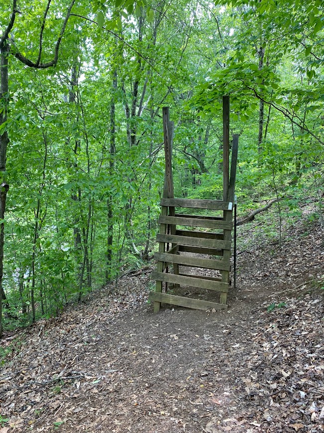 Occasionally the trail climbed triangular, steeply pitched, wooden slats to cross the barbed wire fence enclosing a pasture. I ate lunch beside a wide creek. It turned out my pace was better than I thought, because not long after lunch I came across the road to Bear Garden Hiker hostel. My next box was there and I ran into Serendipity, who was staying the night.