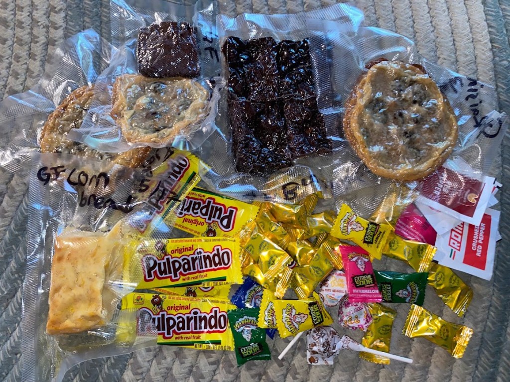 Oooh, surprise box! It contained vacuum sealed cookies, brownies, cherries, and a piece of cornbread; plus sunflower seeds, spicy tamarind pulp candy, and hard candies. Fun! Home-baked GF baked goods are such a treat, though it was the cherries that I soon devoured. Forrest sent the box and most of the goodies while Leo made the brownies. I have awesome friends!