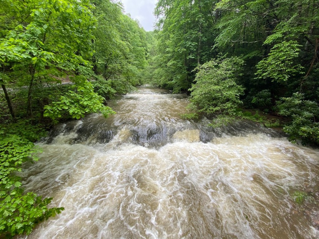 While fetching water from the creek I noticed it had risen at least a foot overnight. This was a theme during the day. We encountered two raging creeks that luckily had bridges and a small one which we forded. One of our friends crossed Lick Creek, the one we rock-hopped, yesterday, and it was a waist high ford! It’s crazy how much the water rose within 24 hours.