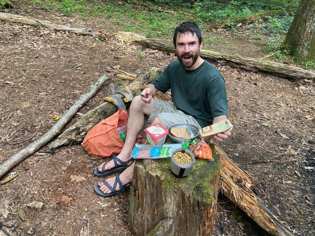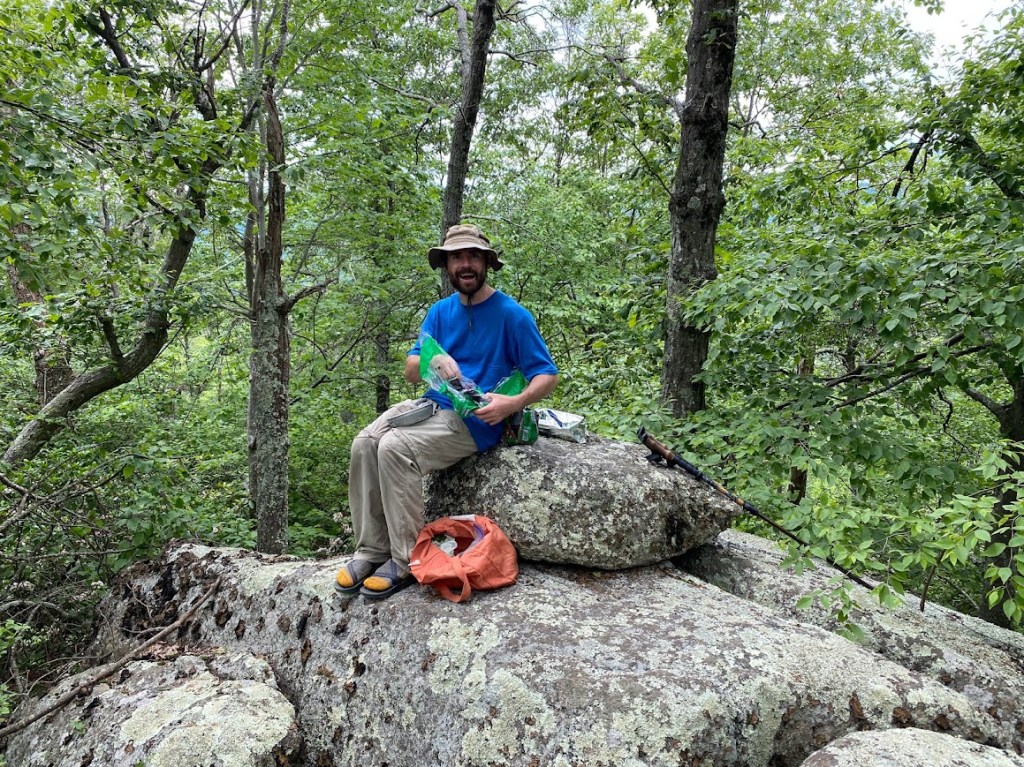 We stopped at Punchbowl shelter. Engineer, now Skivvies, was there and I introduced Mike. Skivvies was trying to arrange a shuttle to Lexington, but low on phone battery. I loaned him a battery pack while we filtered water. Mike opened a bag of sweet potato chips to share while I shared brownie bite balls. Then we hiked another mile or so and found a great camping spot amongst trees.