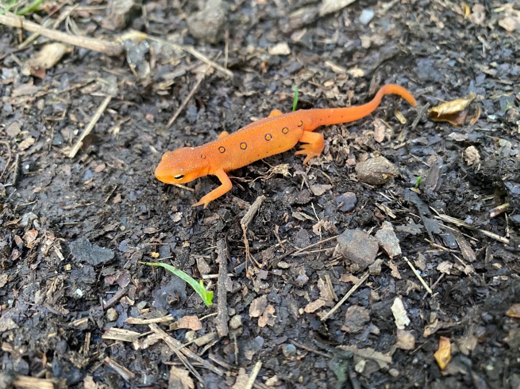 My rain fly was damp, not wet, from a light rain that fell overnight. The rain continued in bursts while we took down camp then was done for the day. The trail wound up Humpback Mountain, which featured vistas and beautiful pink mountain laurel bushes. After the summit, the day was mostly downhill. We came across two red-spotted newts; usually they are chill, however one scurried away when I went for a picture.
