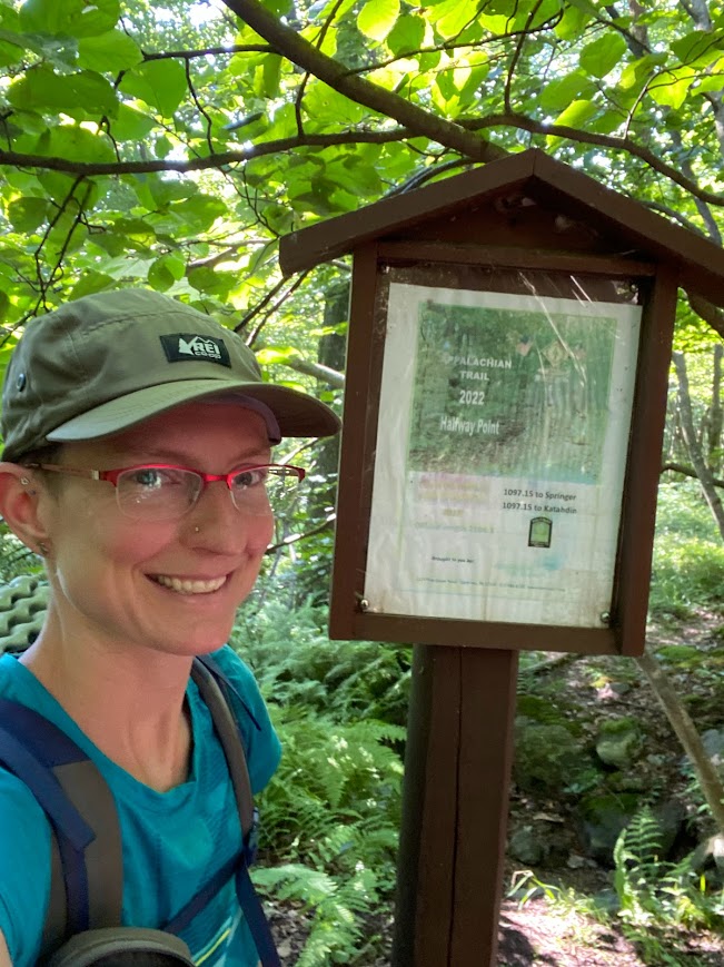 We were fore-warned that in 1.3 miles there would be a trail magic breakfast. I hoped for and got hashbrowns and eggs! The two guys serving breakfast were a thru-hiker from last year, named Upchuck, and his friend, both from Ohio. Though he had camped separately from the rest of us, Bumblebee rejoined our group during breakfast and only 0.65 miles later we made it to the trail’s actual midpoint. Yay, so exciting to be halfway to Katahdin!