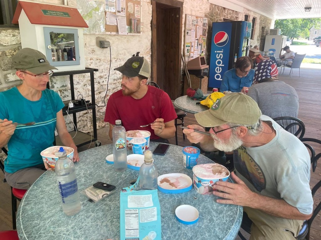 Mid-day found us in Pine Grove Furnace State Park. We stopped at the general store for the half gallon challenge, which entails eating a half gallon of ice cream in 30 minutes. Apparently Hershey’s ice cream does not come in half gallons. Come Along, Bumblebee, and I got 1.5 quart containers of Neapolitan ice cream. The guys each got an additional pint, but I felt challenged enough attempting three pints. Bumblebee finished in 22 minutes, Come Along in 25, and myself in 39. I immediately ate some Fritos, needing salt to balance the sweet.