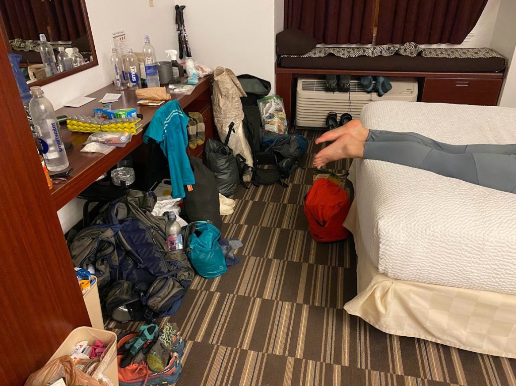 Another continental breakfast to peruse! This one had granola and fresh-tasting orange juice. Per usual, we left full trash cans in our room. Both residue of trail meals and packaging from resupply items portioned into Ziplocs. A man in an extended cab picnic gave us a ride back to the trail.