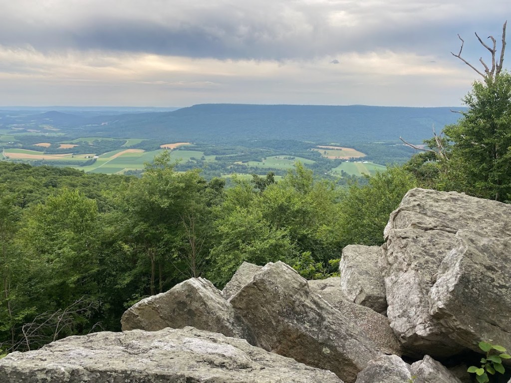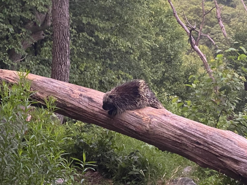 Our camp site was adjacent to the Dans Pulpit overlook. After setting up our shelters and rain covers, we walked to the view for dinner. A large porcupine was hanging out on a log! So exciting! I hadn’t seen one before! It trundled off when we got near, then returned to the log where it splayed out and chewed. We watched it while we ate and heard an odd calling noise in the forest behind us. It turned out to be a second younger porcupine approaching the rock on which we sat. It was adorable! We returned to camp to finish dinner and not be caught between the porcupines. The rain never came.