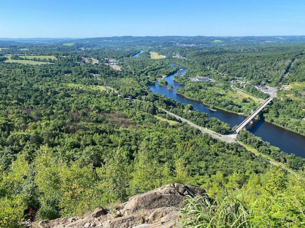 Near day end we were all tired and eager to reach our destination. For around a mile, the trail wound along the edge of the ridge with a view into a valley which contained a winding river, small city, and forest. The AT is usually stingy with views so I was impressed by the length of this one. A Canadian thru hiker pointed out tiny blueberries growing in low lying bushes beside the trail. I snacked on at least a dozen and they were delicious.