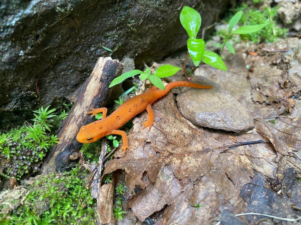It was sprinkling and I saw a vibrant red-spotted newt on the trail, which was then an old road. I hadn’t seen one since Virginia and was excited as they are amongst my top trail critters. All The Way spotted one that was a dull orange and then I saw a tiny one, no longer than the top segment of my pinky. They were all over; we kept looking for them and keeping count. Far down the road we spotted blazes and turned onto a path that generally ascended. We ran into a couple who asked why we were headed south. I was confused, apparently looking down for newts we missed a blaze and skipped a section of trail. Oh well, worth it to see 36 newts! We turned and followed the couple into Delaware Water Gap.