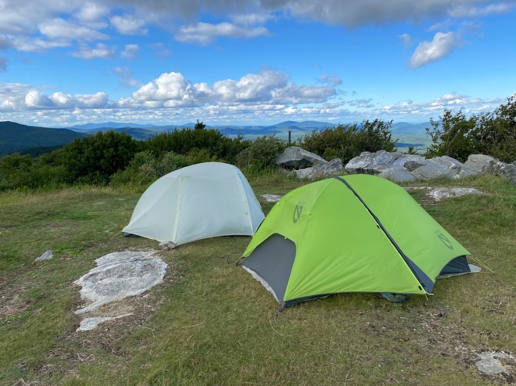 Mid-afternoon we got shuttled back to the trail. My ankle started hurting within the first mile, but the pain had shifted toward the back of my ankle. Plus it diminished as we climbed. Serendipity said the shifting was a good sign. We hiked three miles to camp on the summit of Bromley Mountain. The summit had a warming hut and ski lift.