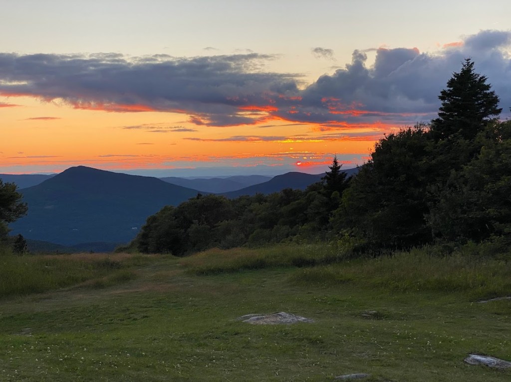 We ate our dinner in the hut, chatting with a 17 year old hiker named Dam who is hiking the Long Trail. Money Stache showed up as we finished dinner. He and I taught Serendipity how to play Pokémon Go. It got chilly as dusk approached, making Serendipity & I decide that perhaps we do need more warm items for the White Mountains. We ended the day watching a colorful sunset.