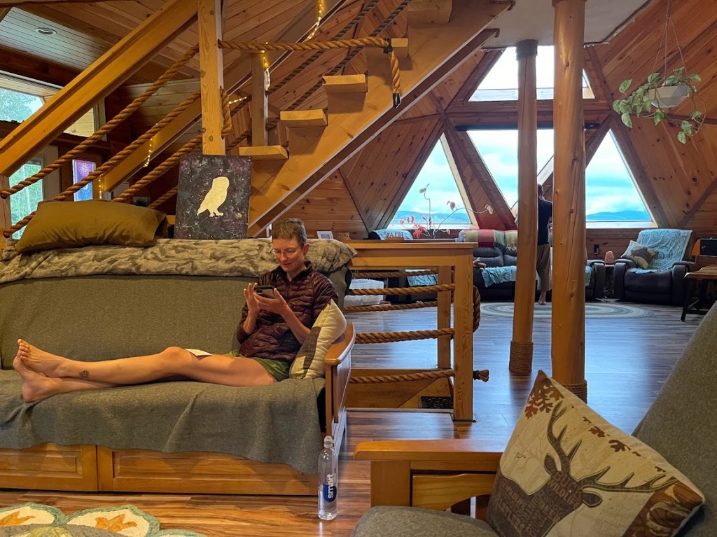 The shuttle took us by Mills Market for a resupply. I only got a snack as I had a box waiting at our next destination, Human-Nature Hostel. The hostel was housed in a timber-frame geodesic dome on the edge of the woods. The interior had gorgeous wood-lined walls with triangular windows. There was cozy furniture, soft music, incense… a relaxing vibe. We each got the full experience which included lunch, dinner, and breakfast before our ride back to the trail.