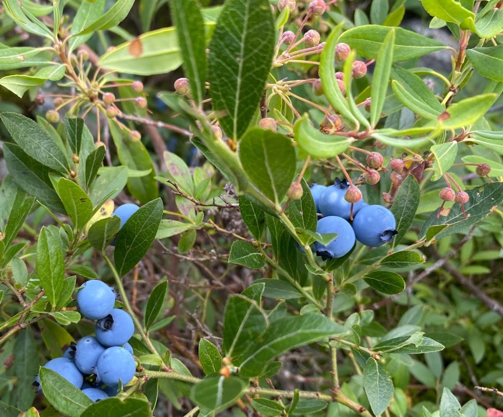 The ground was often muddy from last night’s rain and a couple times I spotted moose tracks. Serendipity, Tracks, and I took snack breaks in a clearing and at a lean-to. While at the latter location, I gathered water from a clear stream gushing over a rock. As we descended, Serendipity and I came across a multitude of blueberry bushes. We stopped to graze; some of the berries were huge!