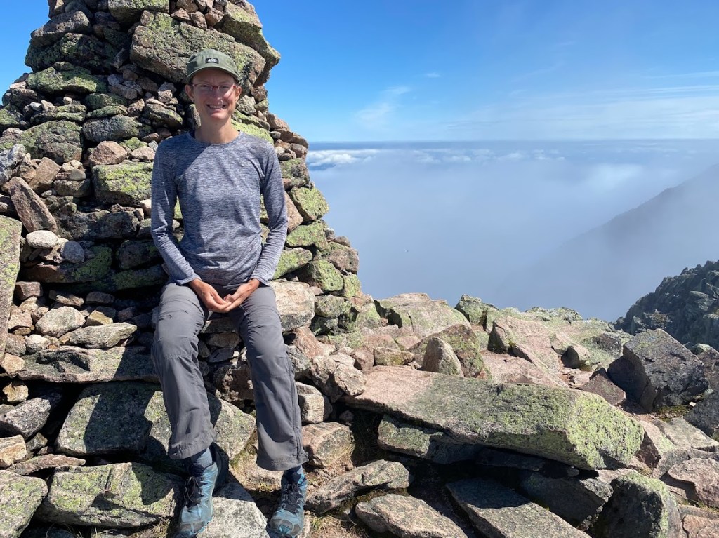 After 0.7 miles of scrambling, the trail flattened out and we resumed standard hiking. Soon we encountered thru hikers descending. I fist bumped congrats to Sir Elton, Hypo, and Burnt Foot. Near the top I congratulated Rawhide and Florida Man. Then I was at the end of the Appalachian Trail and on the highest summit in Maine. It felt a little unreal to be at the end of such an epic journey. Our first pictures had a grey background, yet as we took a snack break the clouds dissipated to reveal sunny blue sky. Katahdin rose above a sea of clouds, though here and there a gap showed lakes and trees. We got a second round of pictures.