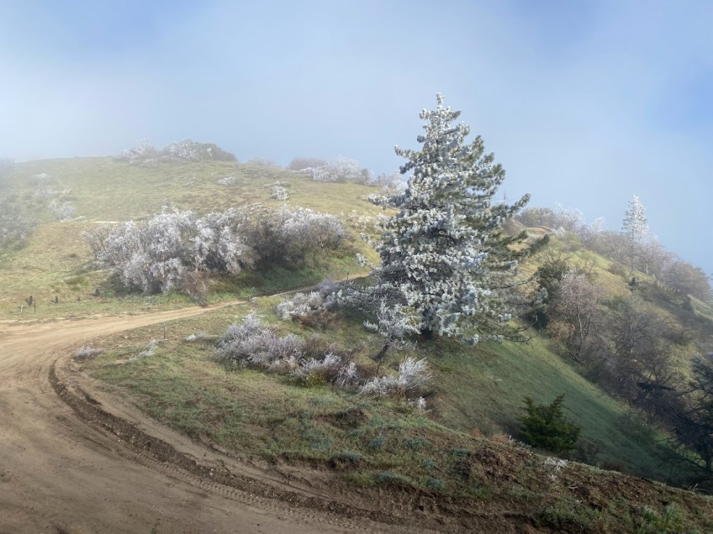 There was frost on my tent when I got up. It was cold so I had a bar as I packed, saving my oats for later. After I took down my tent, I helped Martina with her stakes. My GoreTex outer mitts kept my gloves dry and it saved her hands from getting cold. When I began hiking, I came across lovely ice-coated pines.