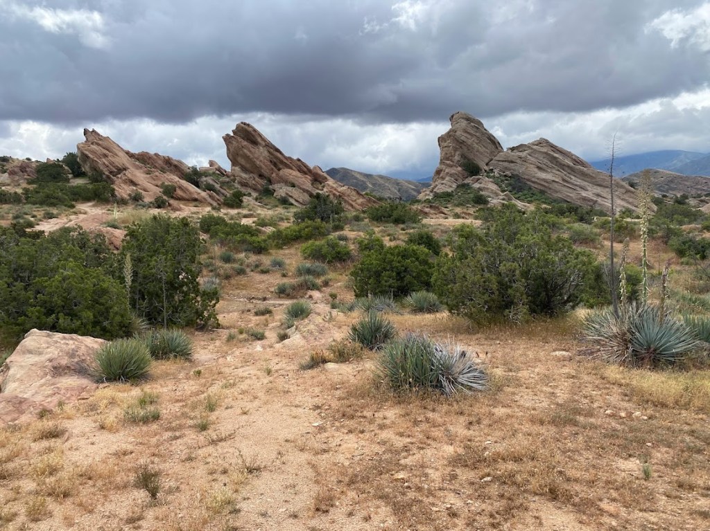 Our day started slow. We lounged around the RV, packing leisurely. While Martina and Karin shopped at the 2 Foot Adventures trailer, I got on trail. Immediately I was in a neat area called Vasquez Rocks, where a series of angled rocks reminded me of the Flatirons in Boulder. Then a long tunnel took me under the highway. I was excited to see colorful pink blossoms on a variety of cactus which were full of buds a couple weeks ago.