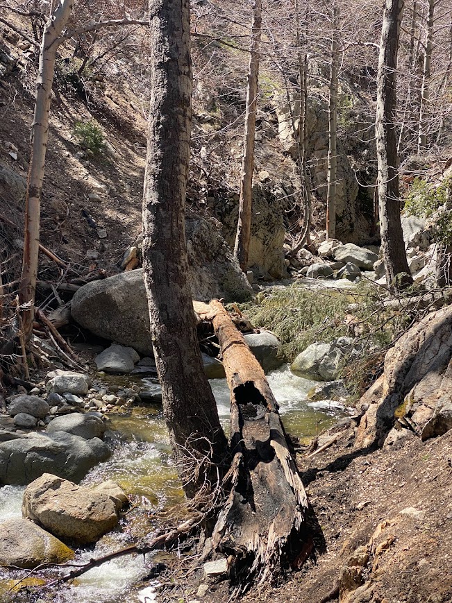 For perhaps the first time, I beat Karin out of camp. She caught up while I filtered water and we walked 4.5 miles on the PCT before turning onto the Buckhorn Trail. (The PCT was closed for the next four trail miles to protect the endangered Mountain Yellow Frog.) We crossed a creek twice, doing so on gigantic tree trunks that had fallen across it. The trail zigzagged across a steep hillside and at one point there was a waterfall coming out of a tree. We ate lunch at a picnic table in the Buckhorn Campground.