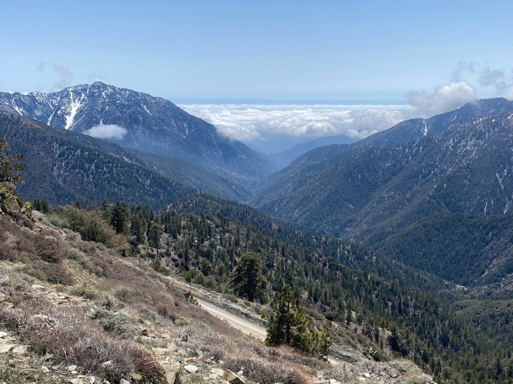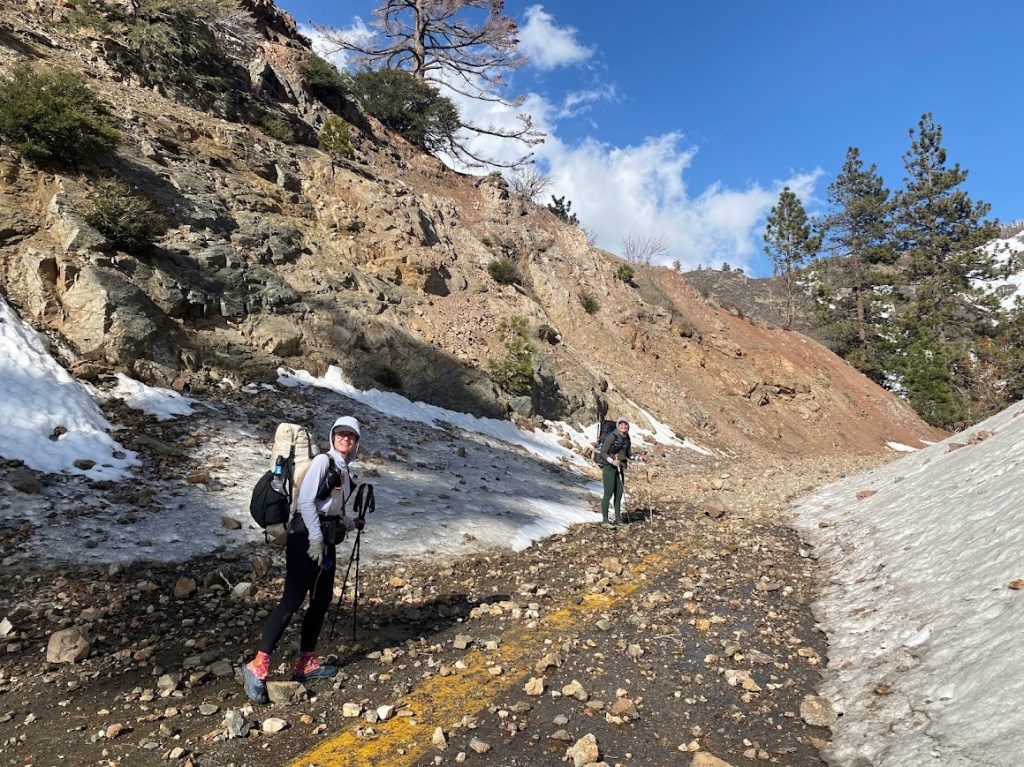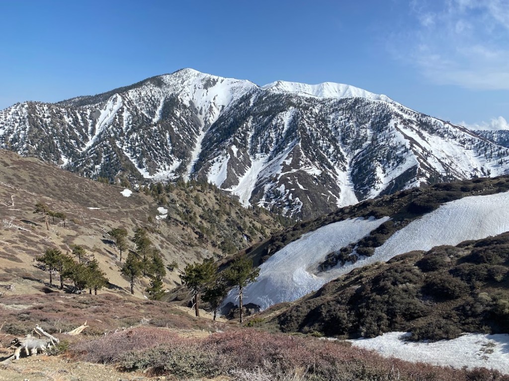 After 4-5 miles of patchy snow, we abandoned the trail in favor of the Blue Ridge Road. The two generally followed the same path and the road was easier to walk. There was a point where we had cell service and discovered that Martina had hiked into Wrightwood. Continuing on, we ascended to over 8,200 feet, encountering ever larger patches of snow and a fierce wind. I enjoyed the impressive views of snow cloaked Mt. San Antonio along with neighboring Pine Mountain and Dawson Peak.
