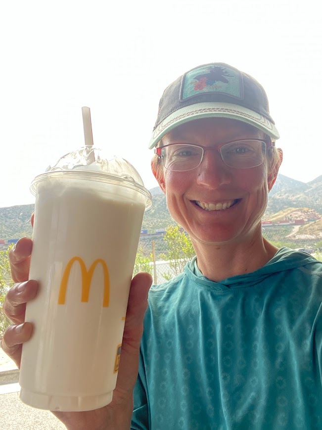 At the base of the descent, the fog dissipated. The trail rose over rocky hills, crossed a train track, and took a tunnel under a second track. We encountered Glamazon, Smiles & Leilah headed north; hiker friends! Another long tunnel took us under I-15. Cajon Pass has a McDonald’s and it is hiker tradition to stop for food. I got a large vanilla shake and Karin got two large orders of fries. We celebrated one month and 460 trail miles!