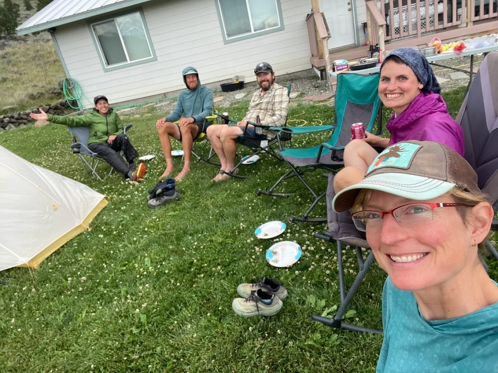 Rather than set up tents on wet grass, we moved the picnic tables so we could cowboy camp on the gazebo floor. However, a bathroom sign warned of sprinklers overnight. Maile, Kaila, Pluto, and Sandbag set up their tents. Sky-Hi, Karin, and I chanced it and cowboy camped. The three of us shared anxious minutes when one sprinkler zone sprayed the poles on the opposite side of the gazebo. In the end, I felt a dry tent warranted sleep lost to apprehension.