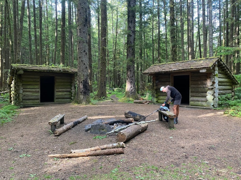 On the beach and in town, we hiked as a group. In the forest, I hiked off and on with Sandbag and Pluto. After the trail curved deeper into the forest, we entered a camp consisting of three wooden cabins, a covered picnic table, and a pit toilet. Each cabin had two solid, wooden bunkbeds. Sandbag, Karin, and I slept in one while the guys claimed another. It felt like being on the AT!