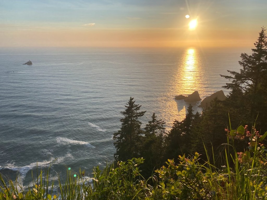 We ate dinner at the picnic table. Then we walked a path towards the coast, finding an old bunker covered in vegetation and a magnificent view of the Tillamook Rock lighthouse. It was the last day of spring. All of us watched sunset turn the sky pink above a blue ocean.