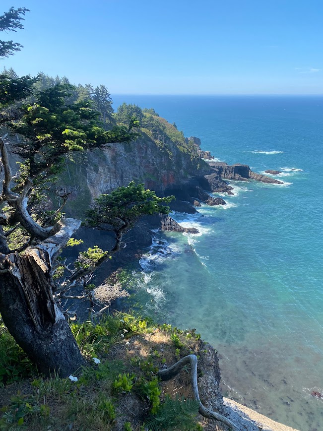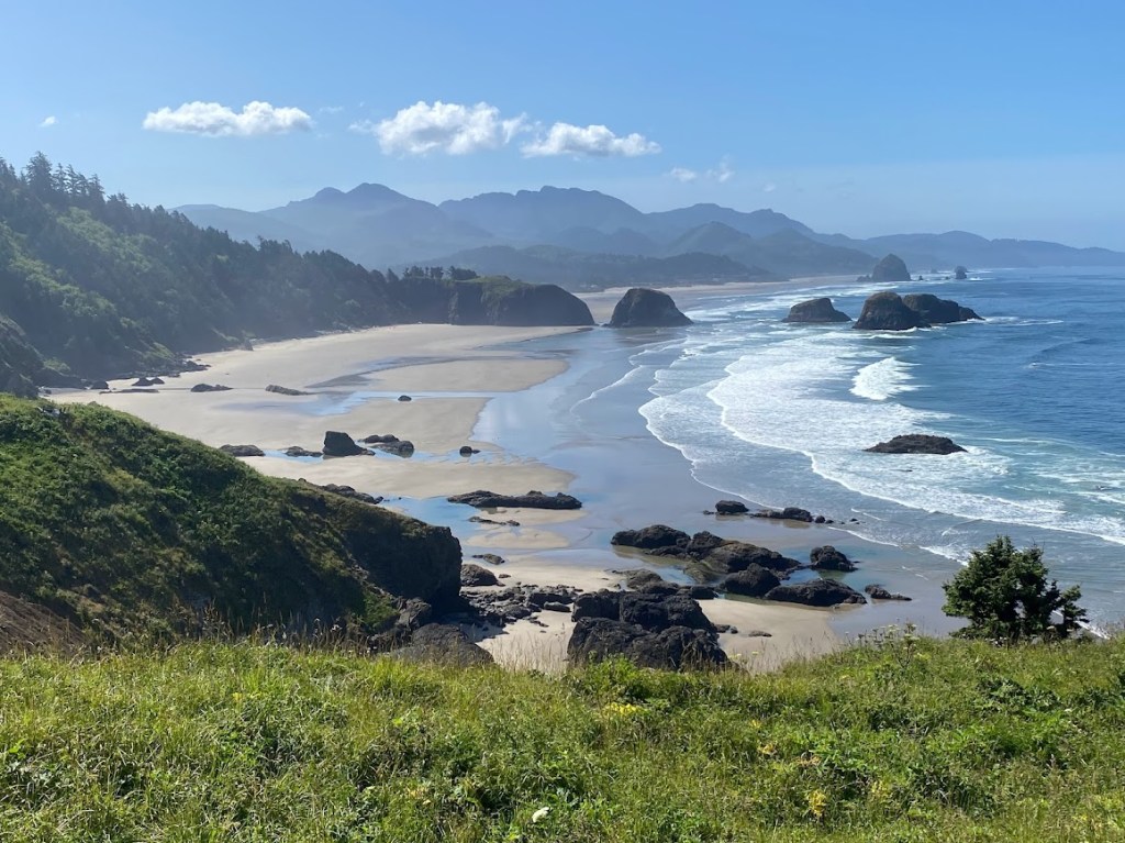 It was a beautiful sunny morning. The five of us ate an unhurried breakfast before heading into the forest. Sunbeams illuminated the ferns. The coastal views were amazing! The low tide revealed huge swaths of smooth sand and waves broke against rocky islands. At Ecola Point, I saw a backdrop from the iconic film Goonies. Re-entering the forest, a sign warned that the trail was for “experienced hikers only”.