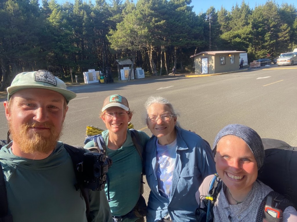 Following our resupply, we decided the best option was hitching to a beach to stealth camp. However, as we walked to the road junction, Sandbag spied a grassy picnic area behind a food truck. She inquired and the truck owner kindly loaned us her port-a-potty key. We gratefully pitched four tents near the area’s grassy edge.