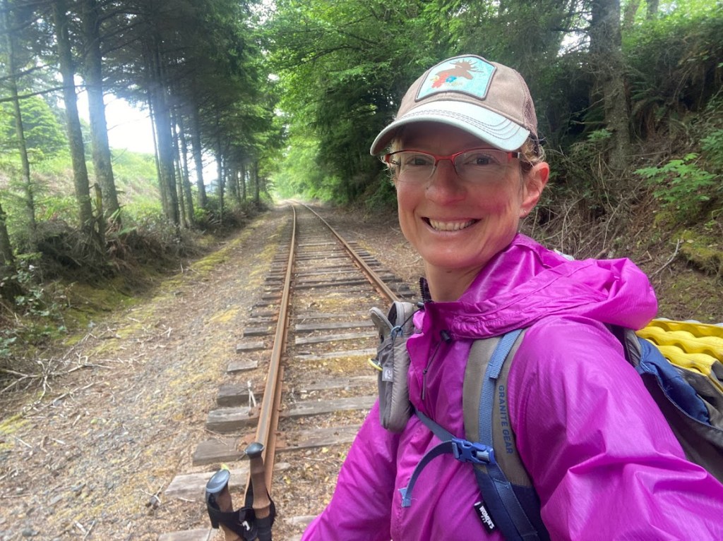 In the early morning, I got up to pee and saw the big dipper, a faint moon glow, and the tide rolling in. After breakfast, I walked down that same beach with Sky-Hi. My feet left footprints in a vast sheet of untouched sand. At the end of the beach, a snippet of gravel road plus a cute little suspension bridge took me back to the trail. Then it was a choose your own adventure. Sky-Hi hiked Highway 101 to Manzanita, the rest of us took the forest trail.