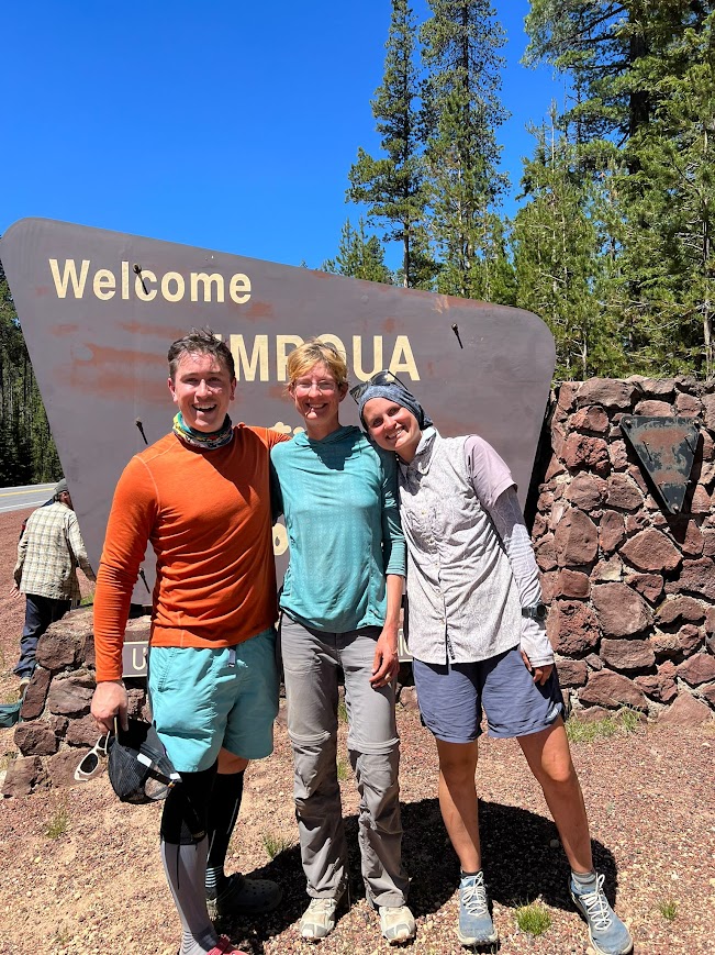 I felt lethargic. After hanging by the sign for a bit, I started out slowly. I came across a water cache and chatted with two SoBo girls, dawdling and gathering information on snow conditions. Then the trail began to climb and my energy returned. I caught up to and passed Sky-Hi, Hobble-it, and Sandbag. At the top, a junction with views of Diamond Lake and Mt. Thielsen, I found Miles and Pluto. We took a long snack break and one by one the others joined us. Miles lives in Bozeman and is hoping to reach Canada before he returns to MSU for the fall semester.