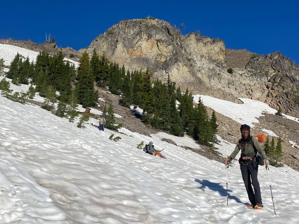 The morning descent to Seven Lakes Basin involved sloping snow fields. At first we delicately traversed them. Then Sandbag, Sky-Hi, Pluto, and I had fun. We slid on our butts or ran with big sloping steps, laughing at falls that turned into slides. Over time the snow fields became drifts amongst the trees then frequent streams.