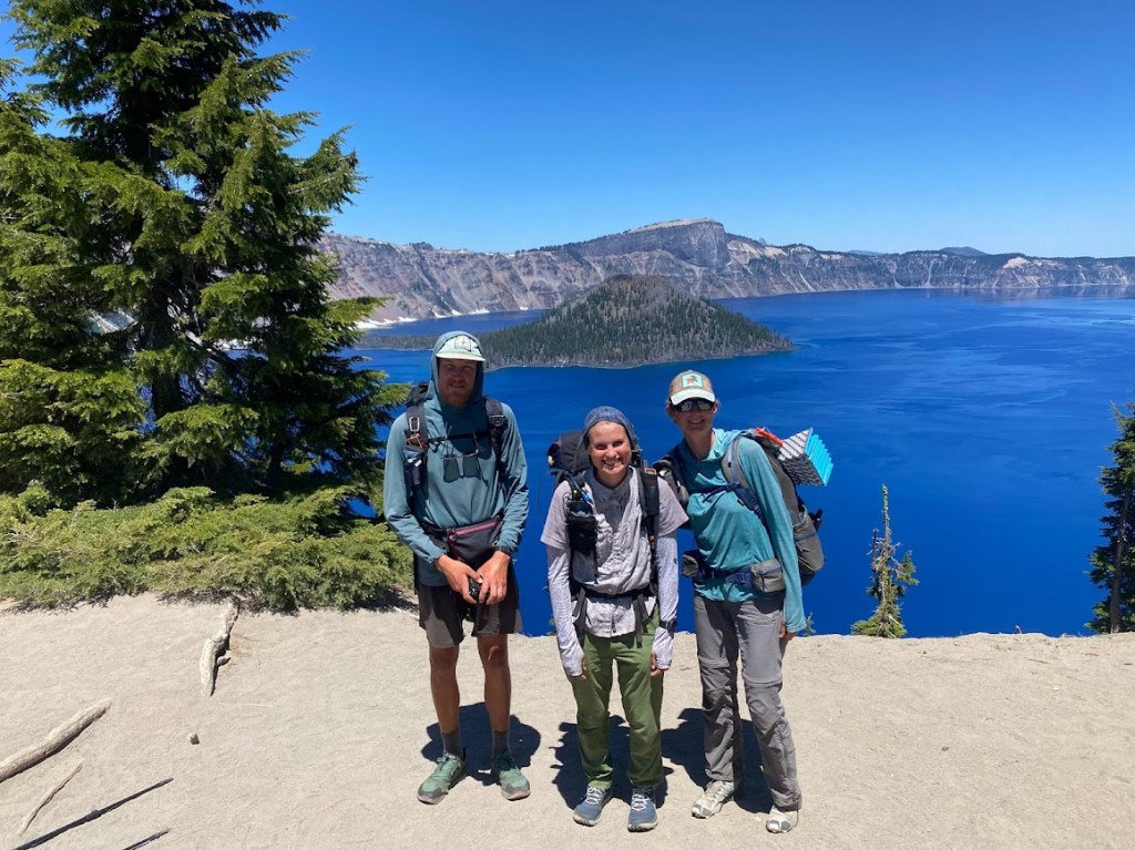 Back at the hiker shed, I chatted with a female, older, French hiker named Raspberry. Then we caught the 9 am trolley to the Rim Visitor Center and Lodge. My first view of Crater Lake… jaw-dropping stunning with its intense blue color and the cinder cone of Wizard Island. A past thru hiker named Moonshine, gave us extravagant trail magic and we had a picnic lunch on a little rock-walled lake overlook.