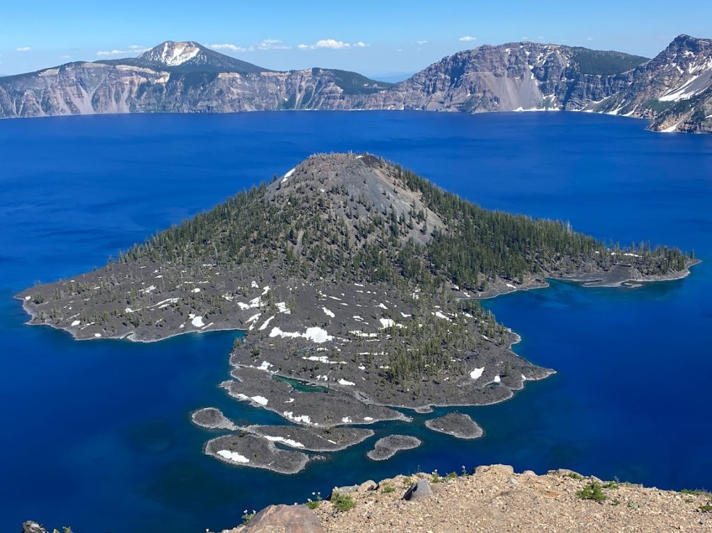 Yesterday was long so this day was all about enjoying ourselves. Rather than hiking the PCT; Pluto, Hobble-it, and I hiked the alternate Rim Trail. It rose and fell, offering frequent views with perilous drop-offs to the lake below. Slowly we made our way around 20-25% of the lake, stopping often to take photos and drink in the beauty. I found Wizard Island intriguing with its cluster of smaller islands.