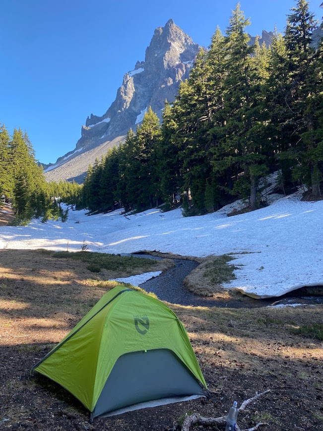 After our break, we went another two miles, crossing a fair amount of snow, none sketchy. Thielsen Creek wound in a picturesque manner with the rocky thrust of the similarly named mountain in the background. It was a beautiful spot and we quickly decided to set up camp, though Miles continued onward. Several dragonflies swooped through the air, likely responsible for the lack of mosquitos. We ate a leisurely dinner accompanied by creek noise.