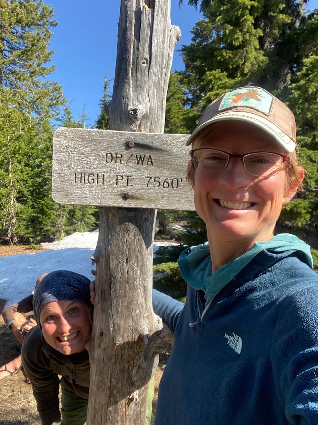 Going out of camp the snow was patchy. When it became continuous, Sandbag and I stopped to wait for Hobble-it. We proceeded as a group to the Oregon PCT high point at 7,560 ft. Pluto was already there and we had cell service so we took a break to wait for Sky-Hi. I googled a movie name for Pluto. Eventually Sky-Hi arrived and informed us of his plan to go back a mile and take a side trail to Diamond Lake. We decided to meet him at Shelter Cove in two days.
