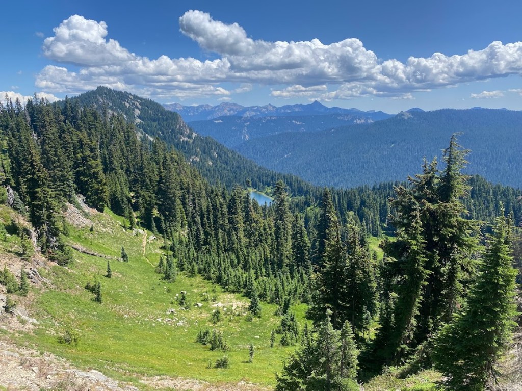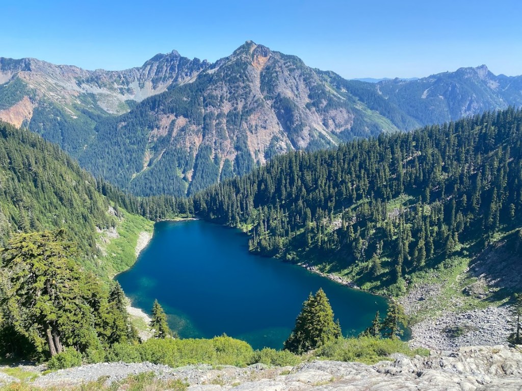A couple miles later, I stopped at Ridge Lake to get water. Sky-Hi guarded my pack from a too bold squirrel that circled us. While I snacked on a GF cookie, we were joined by Hobble-it. The two of us laughed as Sky-Hi chased after the squirrel, which was undeterred. The following miles revealed several deep blue lakes backed by picturesque mountains; I conceded that Washington is indeed beautiful.