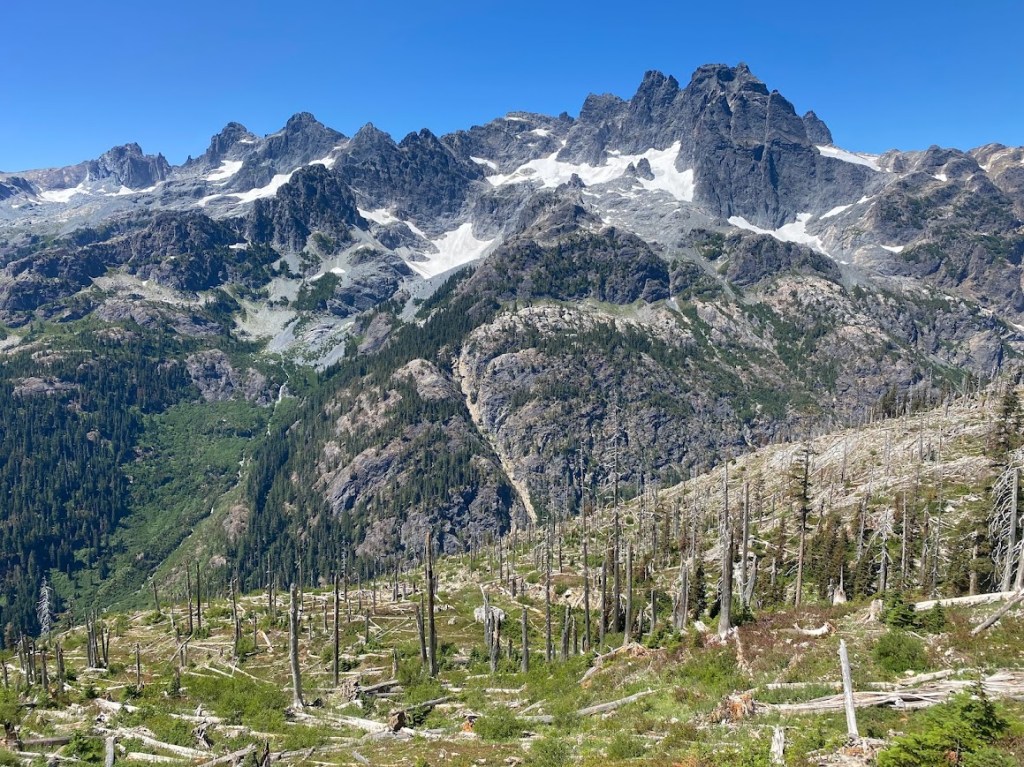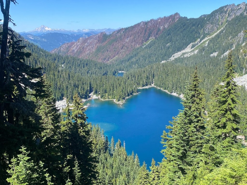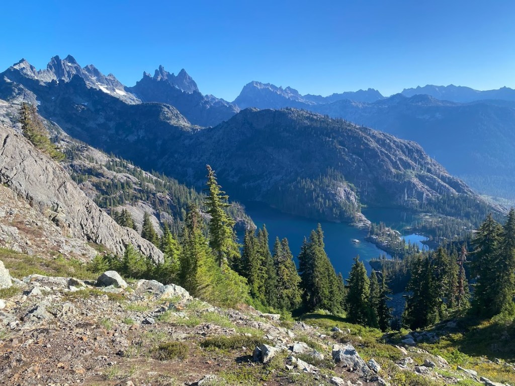 The peak’s descent provided a fantastic view of snow-covered Glacier Peak on the horizon. After a short climb, I took the side trail to Pear Lake. I chugged water and figured out how to send an InReach message to Ludacris’s Garmin. When Hobble-it arrived and went for a quick dip, I decided to wash my calves and feet in the cold water. Then I laid back on a perfectly sloped rock and dried in the bright sunlight.