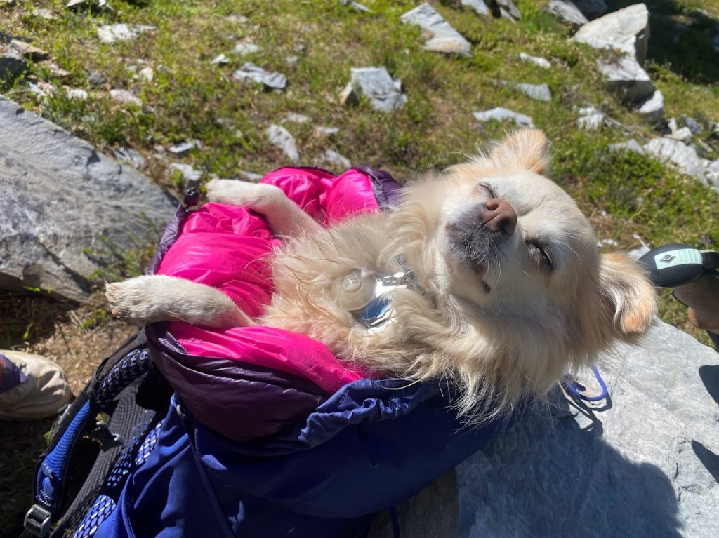 At the top of the climb, I stopped for lunch by a small lake and chatted with a section hiking couple that had a cute chihuahua mix dog. Soon Hobble-it, Pluto, Luna, and Martin joined us at the lake. Luna swam and the dog begged for food from Pluto. Apparently, the dog hurt one paw that morning. Its owner put it into the top of her pack for the afternoon hike and it looked so blissful.