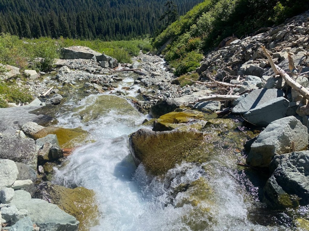 The morning was the perfect counterpoint to the previous day, full of solitude rather than companions. I listened to “The Overstory” with rapt attention, yet noted the beauty all around. I stopped several times for water. My favorite was a cascade that tumbled over giant boulders. I watched the water flowing past as I ate a snack.