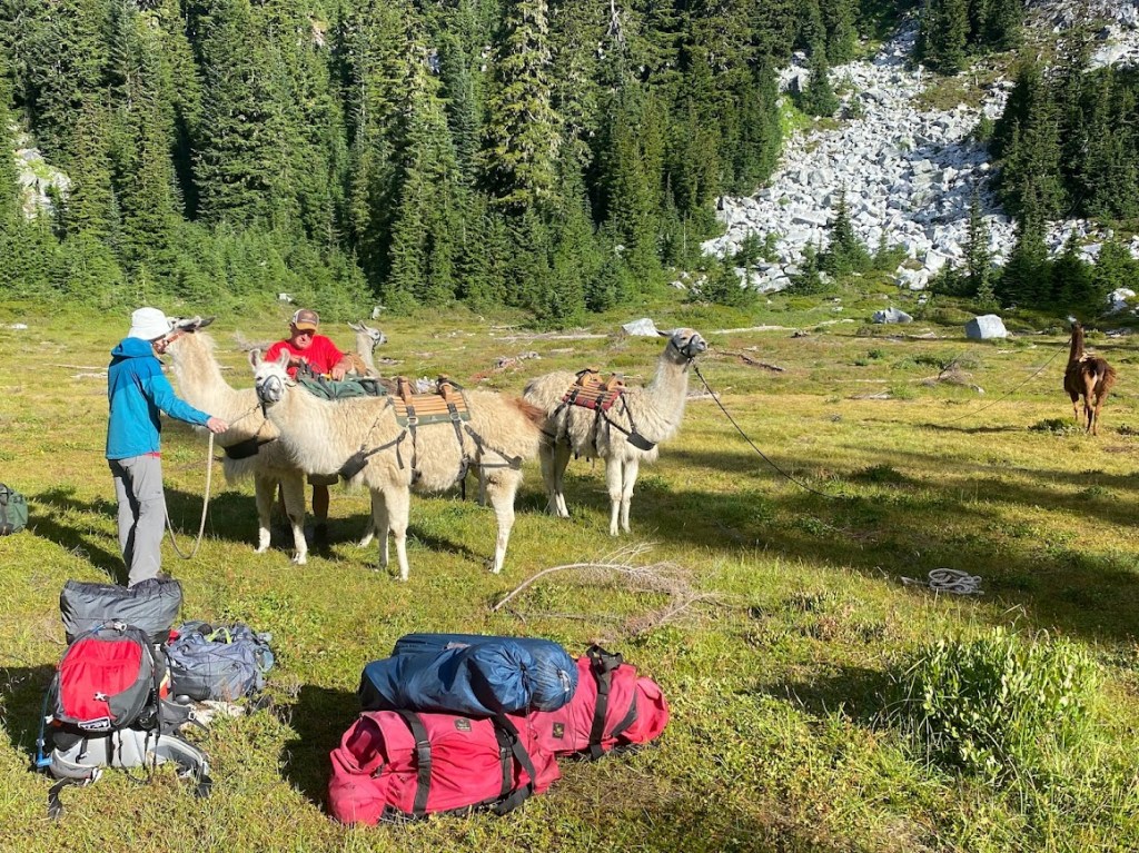 In a meadow three miles along the trail, I came upon six grazing llamas and nine people breaking down camp. I stopped and watched the alert, curious, and expressive animals. An organizer for the group, Pass to Pass for Parkinson’s, told me about their multi-day adventure. The llamas were all female and could carry up to 50 pounds. We chatted for a long time, joined by Hobble-it.