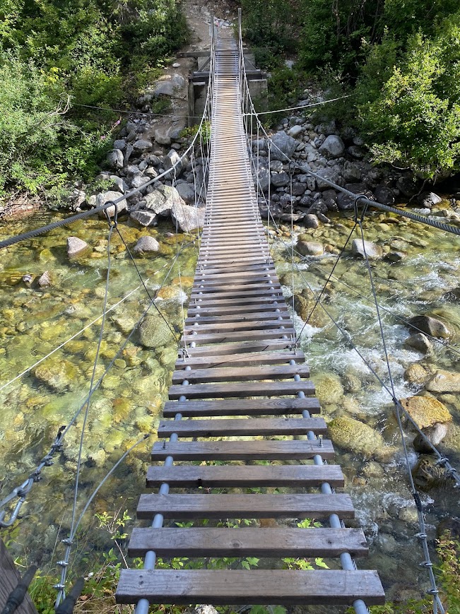 At first the trail paralleled the Stehekin River. When the river turned west, the PCT paralleled Bridge Creek. It started on the right bank, but eventually crossed to the left via a very bouncy swing bridge. Shortly before lunch and much to my relief, I finished Walden. Though Thoreau espoused simplicity and nature, he also had a white elitist viewpoint that wore on me.